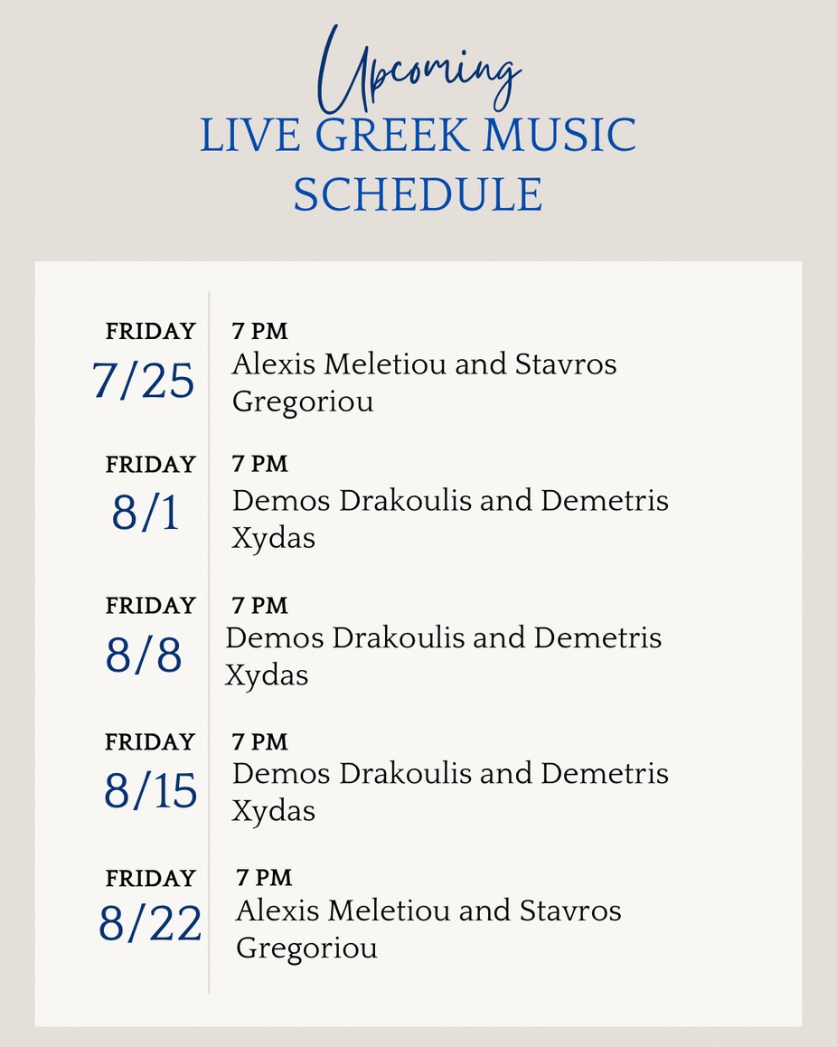 Join us every Friday for Live Greek music featuring various vocal Greek bands. Music Starts at 7 PM